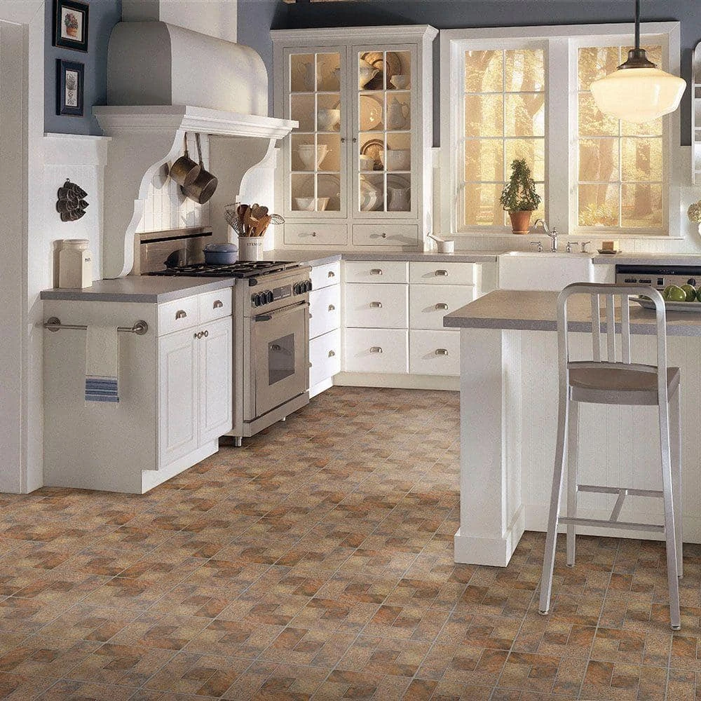 Give your floors an attractive makeover with the TrafficMaster Bodden Bay Terra Cotta Vinyl Tile. The random block stone design makes any room more stylish, and this tile is easy to install and maintain. It can be placed over wood or concrete subflooring and has a 30-year residential warranty.